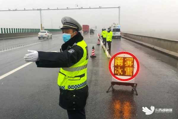 东西湖区交通大队加强高速公路值守警力投入,在收费站、高速路面不间断巡控,在匝口等事故易发路段摆放提示牌、锥形桶,提示过往车辆减速慢行。