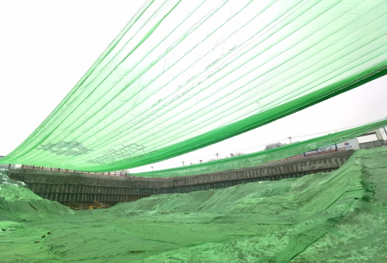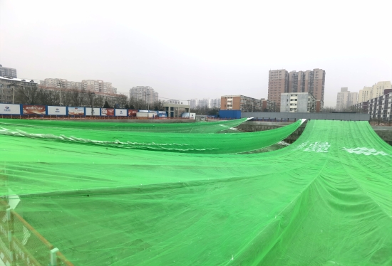 近日,在电建建筑公司承建的北京市海淀区西八里庄项目工地内,一道道绿色防尘网在面积约2万平方米的基坑上方撑起,犹如绿色“天幕”,既可有效减少施工扬尘污染,实现低碳环保,又能起到隔音降噪作用,为钢筋混凝土的工地现场增添了几分盎然绿意。