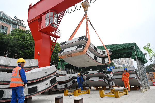 2月6日,中铁八局集团有限公司施工人员在福州地铁滨海快线1标南公园站施工现场吊装管片。