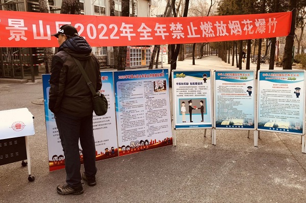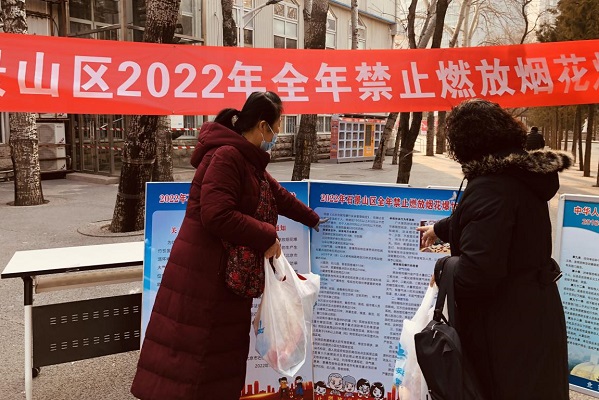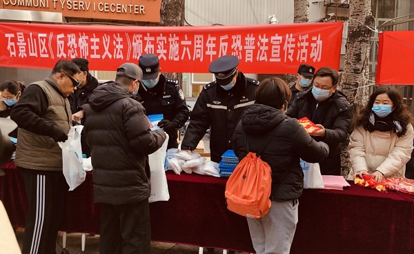 为扩大禁放工作知晓度,让居民知政策、懂法规、守规定,为全力实现老山地区全面禁止燃放烟花爆竹的工作目标,坚决有效遏制烟花爆竹违法行为和相关问题的事故发生,同时为普及防恐、反恐基本常识,提高全民参与反恐工作的主动性和积极性,全力确保平安冬奥、平安春节。根据区烟花办、反恐办统一安排,结合疫情防控工作要求,近日,老山街道组织老山派出所、老山司法所在辖区内以老山东里社区为主宣传点,其余11个社区居委会为分宣传点,每人保持一米距离,戴好口罩,开展“石景山区2022年全年禁止燃放烟花爆竹”及以“石景山区《反恐怖主义法》颁布实施六周年反恐普法宣传活动”为主题的烟花爆竹禁放及反恐怖宣传活动。