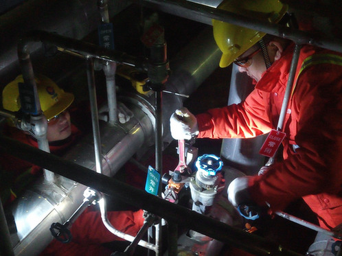 “氮气置换,是用氮气注入储罐内,以干燥空气排清氧气,保证储罐后续安全使用。”据李磊介绍,储罐用来储存低温液化天然气,如果里面还存有潮湿空气,容易造成仪表冻结失效,存在极大的安全隐患。而氮气是惰性气体,在投产前进行氮气置换,可以100%排出潮湿空气。