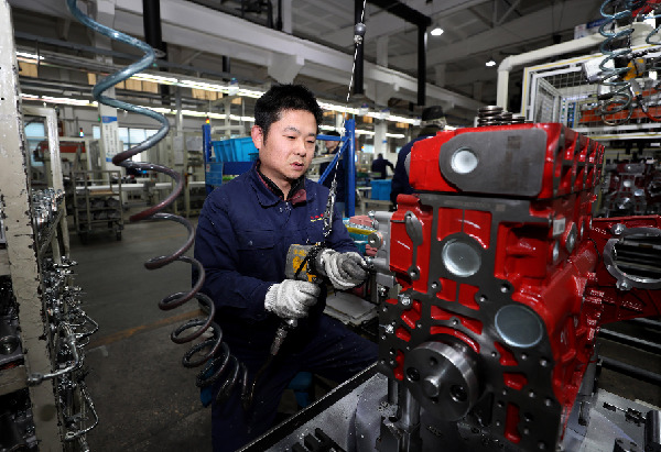 2月7日,在安徽全柴集团有限公司,工人在组装生产发动机。