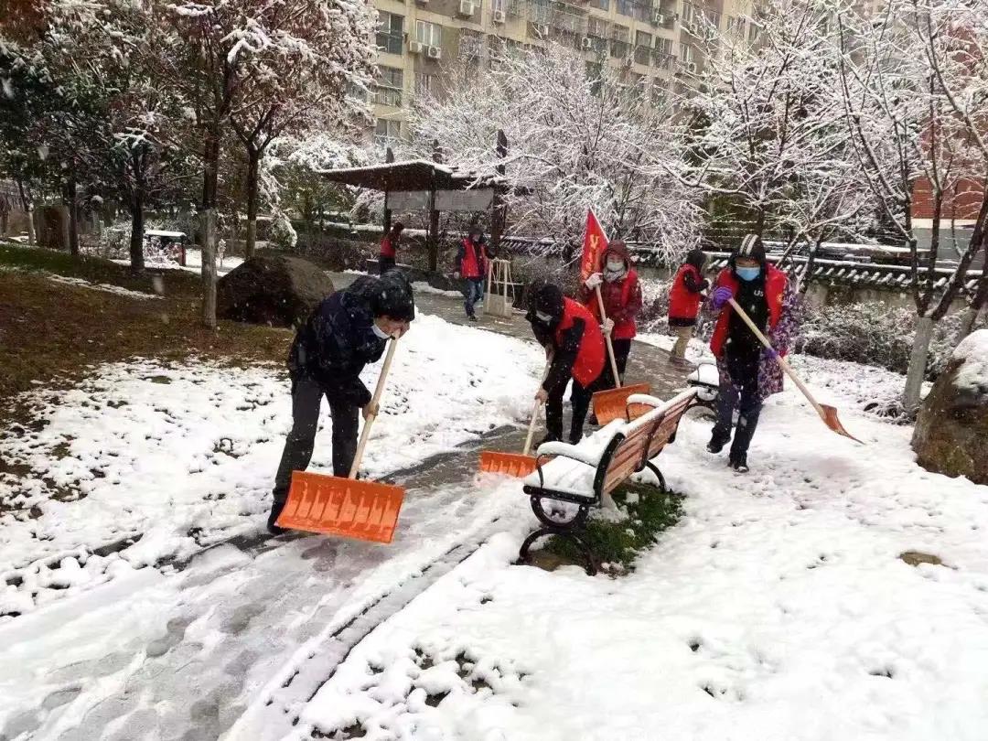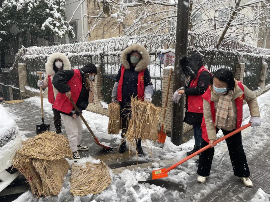 社区工作者、志愿者参与扫雪除冰