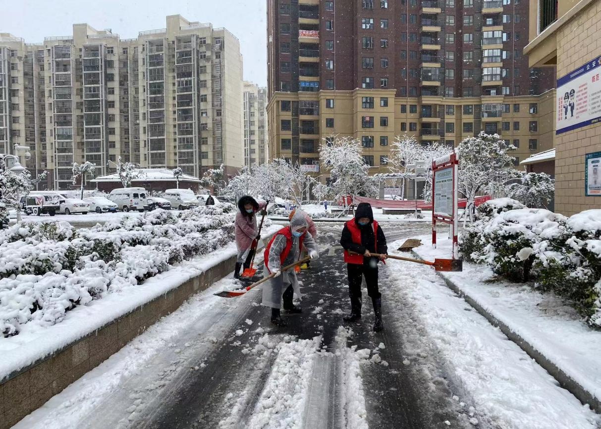 做好自身安全防护后,身穿红色马甲的工作人员、志愿者、下沉党员们,携带铁锹、铲子、麻布袋、草席等工具,对社区大门口、兴达小区和幸福村主要道路、单元楼门前的积雪进行铲除,铁铲与地面的摩擦声此起彼伏。大家一边铲雪,一边提醒出行群众注意安全。