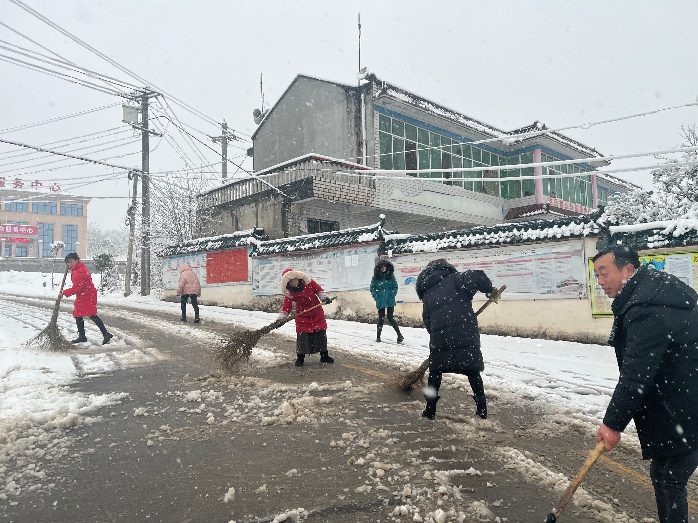 (本网讯)2月7日,受冷空气影响,新一轮降雪导致路面结冰,为群众出行带来不便。为有效应对大雪天气带来的不利影响,消除道路交通安全隐患,太和镇迅速行动,组织党员、干部深入主次干道、村湾路口清雪除雪,确保群众安全出行。