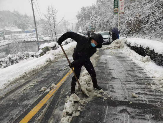 志愿服务作表率。第一时间巡查辖区内各路段积雪情况,动员全体机关干部、各村(居)干部、驻村工作队成员、志愿者等立即投入清雪工作中。由党员干部、志愿者组成铲雪小分队,不畏严寒、顶着风雪,在主干道和村主道路上铲除积雪,以保证居民安全出行。