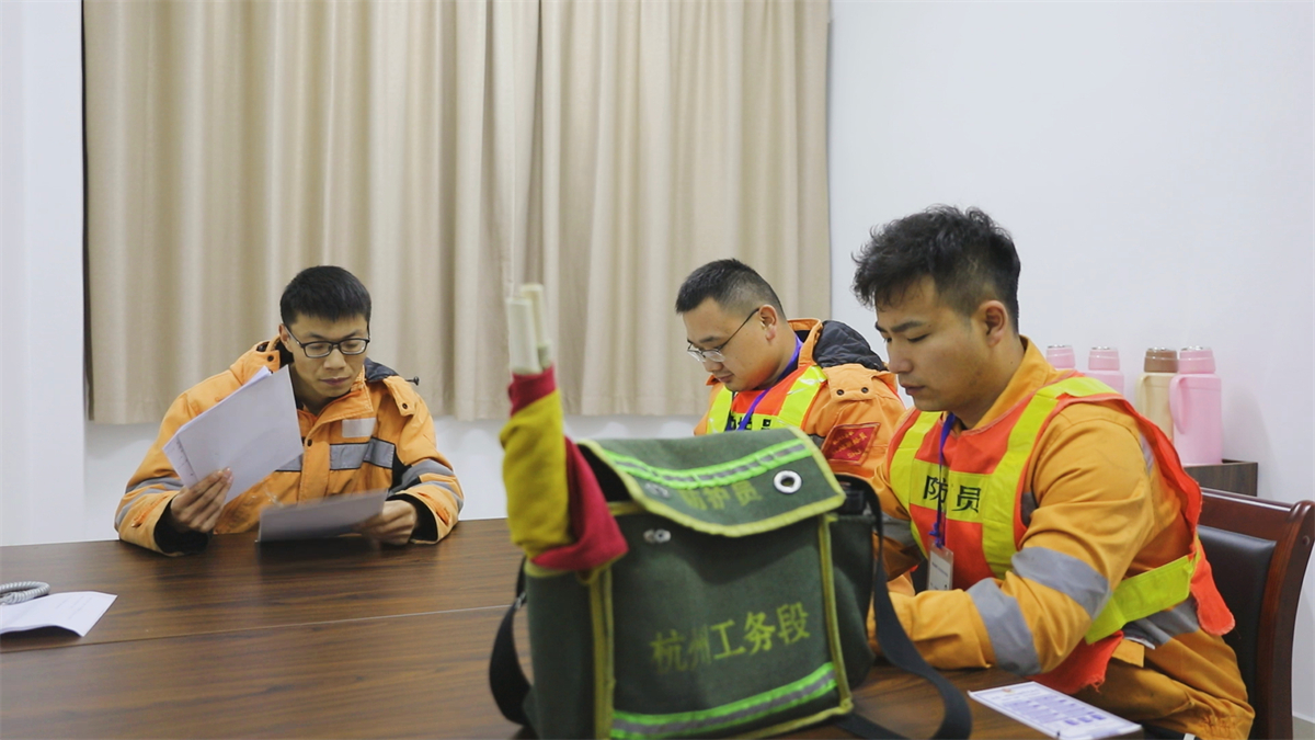 4时05分,登记好作业需要携带的工具,工长徐祥法、班长李雨朔、现场防护员吴琦琦踏上钢轨,往衢州方向前行。驻站联络员李然则守在调度室“大后方”,每隔30分钟与他们沟通联系,确保作业安全。