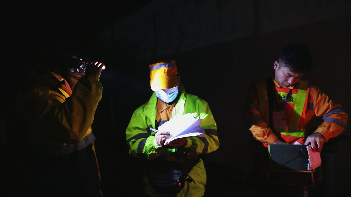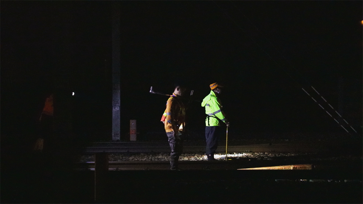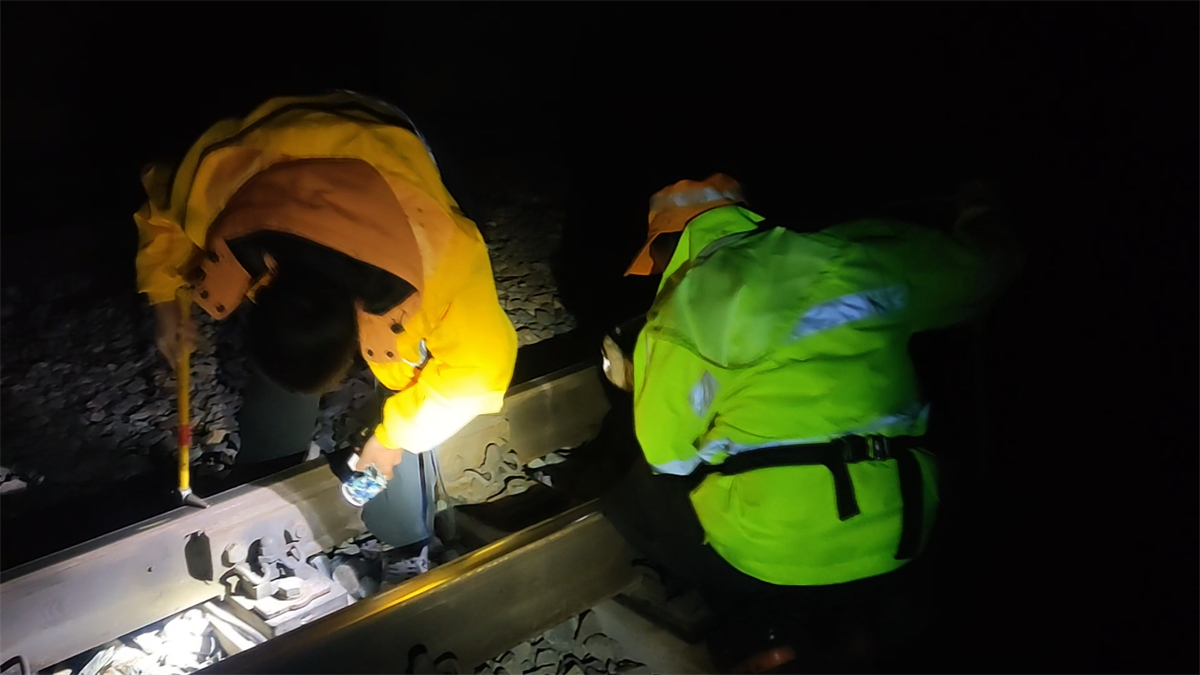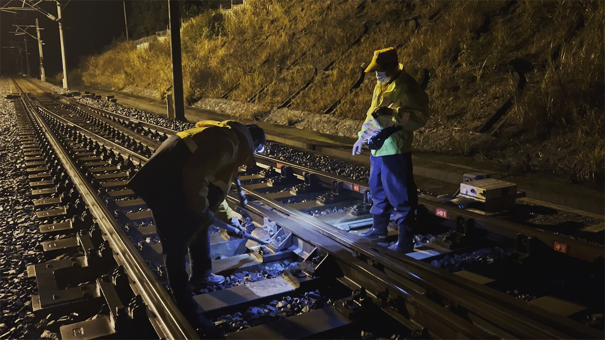 在一处道岔前,李雨朔发现了一颗松动的螺栓。他拿出长柄扳手,弯下腰,迅速上紧螺栓,接着检查下一处。一晚上,这样弯腰检查的动作他重复了上千次。