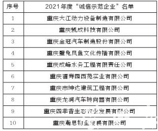 近日,记者从区信用协会获悉,璧山区2021年度“诚信示范企业”名单出炉,包括重庆大江动力设备制造有限公司、重庆凯成科技有限公司等10家企业。