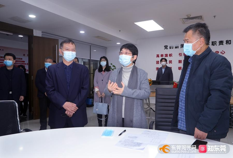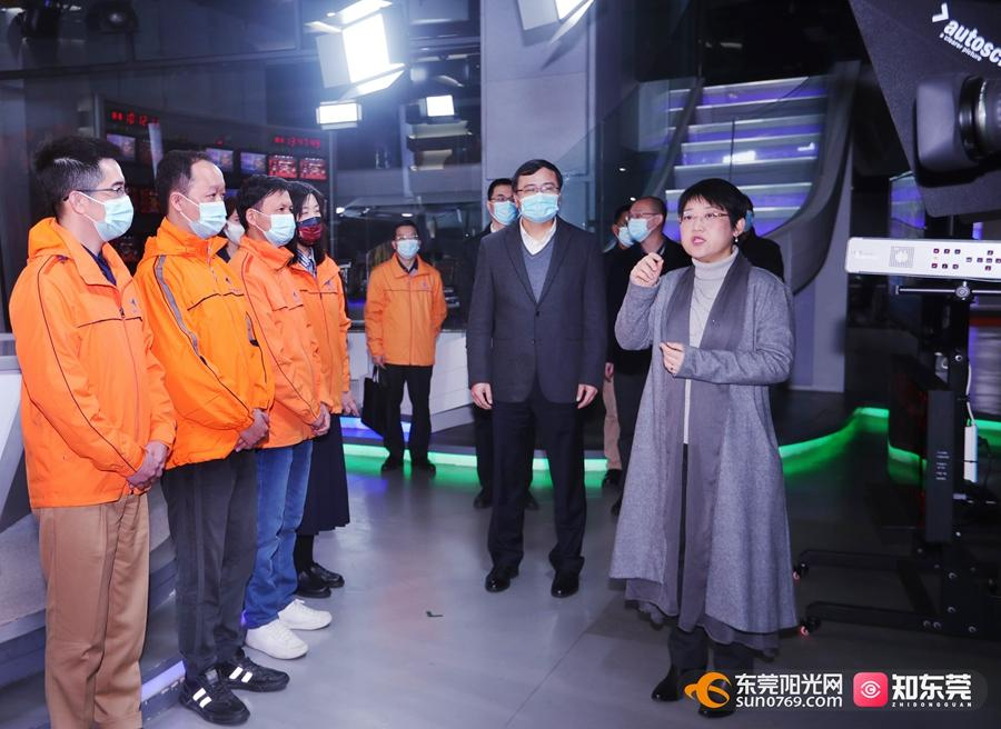 在东莞广播电视台,慰问组一行在东莞广播电视台台长黎树根等陪同下,参观了东莞广播电视台演播大厅、多功能演播厅,并与新闻一线采编人员亲切交谈。她向全体新闻工作者问候致意,并送上新春的美好祝福。