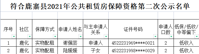 按照《2021年鹿寨县公共租赁住房申请的公告》的要求,2022年1月21日至2022年1月27日止我局组织开展2021年鹿寨县公共租赁住房申请受理工作,共有111户家庭提交了申请。经审核,其中87户符合申请条件,24户家庭因有工商登记、已享受过福利房等原因不符合申请条件。我局于2022年1月21日对2021年度申请家庭审核结果进行了公示,但公示期间部分有异议的申请家庭要求再次复审,经对有异议家庭进行核查和更正,有1户家庭符合申请条件。现将名单予以公示,公示期七天。如有异议,请在2022年2月4日前向我局提交署实名的检举材料,检举人受法律保护。