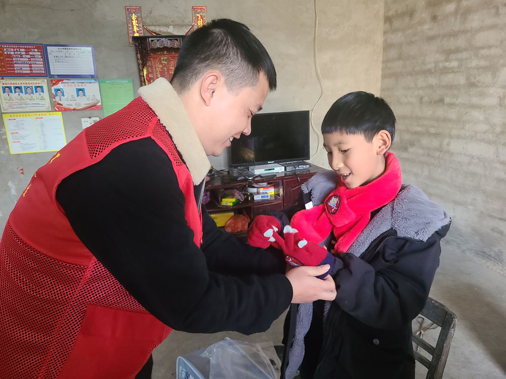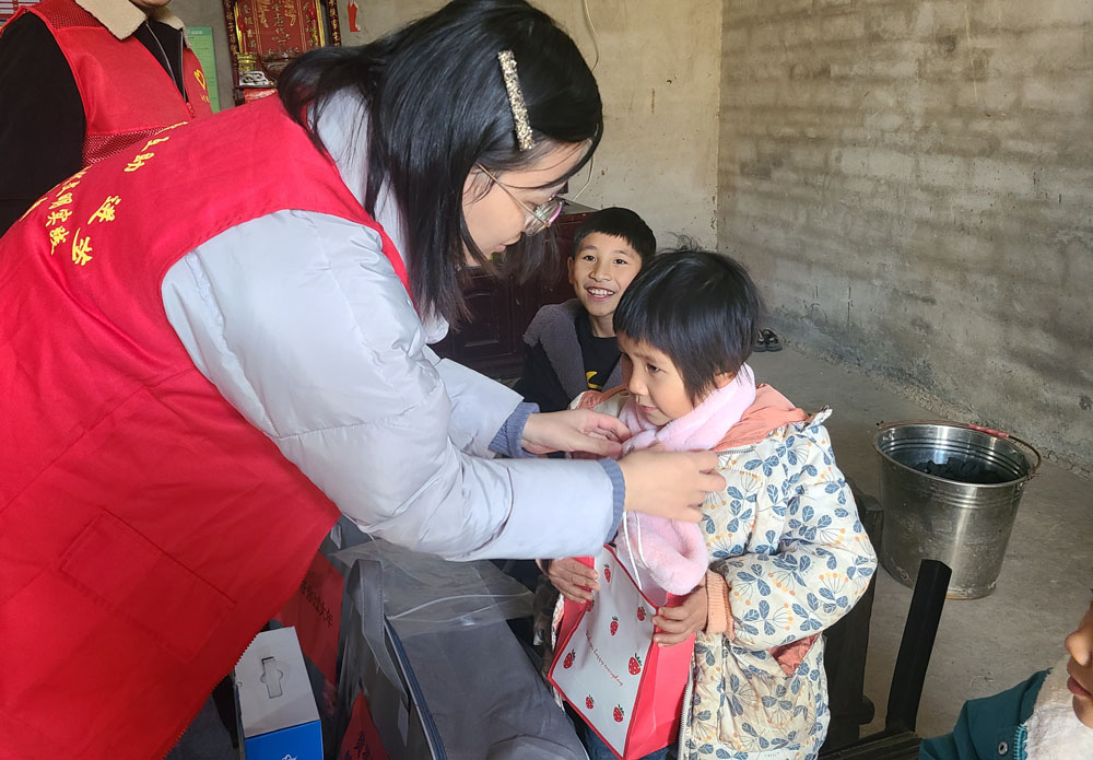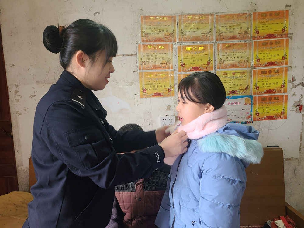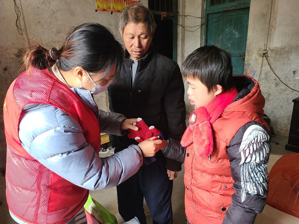 “来,戴上围巾过年就不冷了。”在困境儿童李某的家中,志愿者为她戴上爱心围巾、手套。
