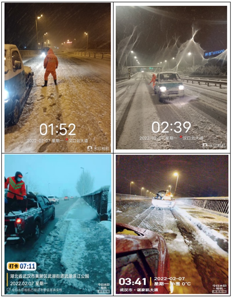 针对此次极端天气,降雪前,武湖街提前部署,详细部署相关工作,每项任务细化到组、到车、到人,建立“各负其责、必要支援、团结协作”的联动机制,确保扫雪工作落实到位。7日凌晨大雪纷飞,环卫人员紧锣密鼓地开展了扫雪铲冰作业,大家努力对重点点位新河桥,滨湖桥,正街汉施路下坡,武黄路实验学校门口桥面,东方城仠佶桥,新天地下穿撒盐,融雪,防结冰处理。