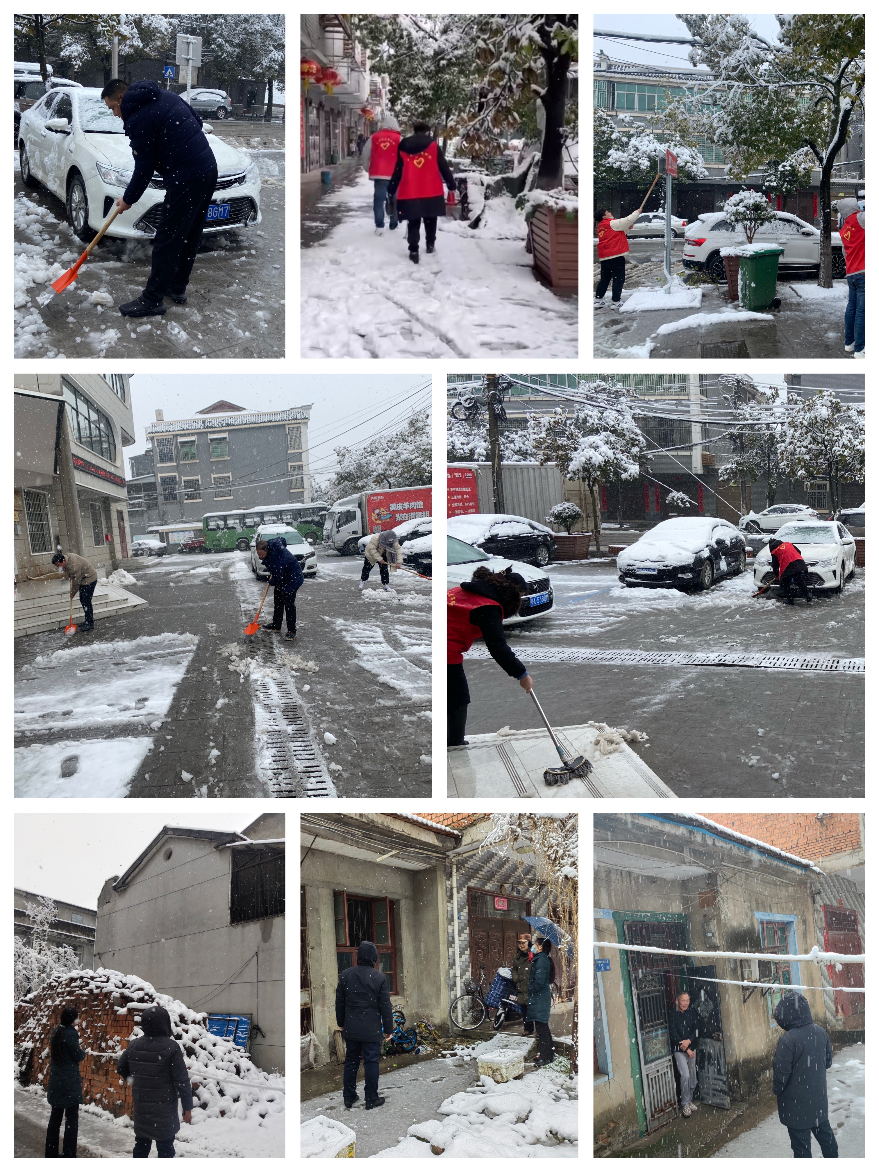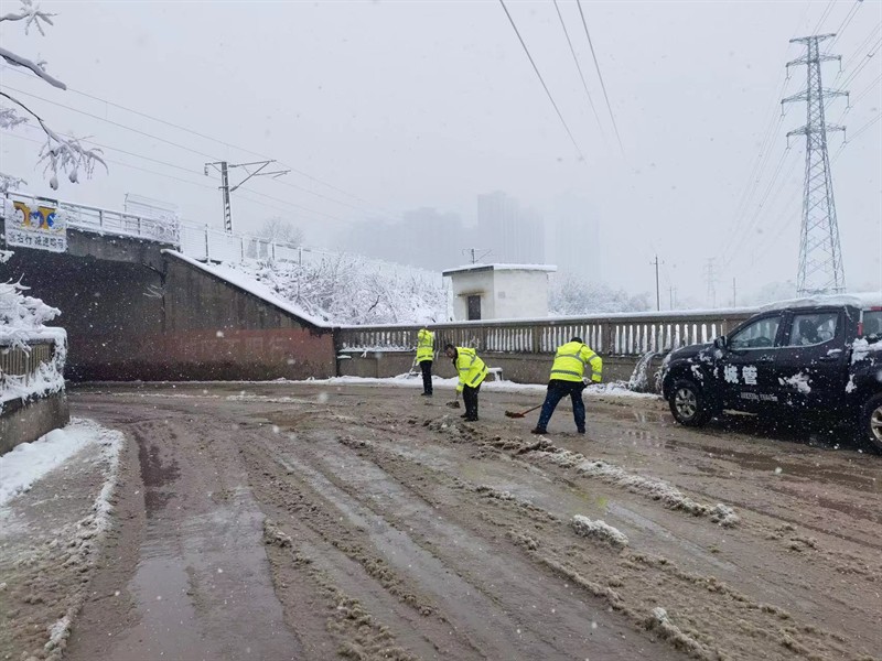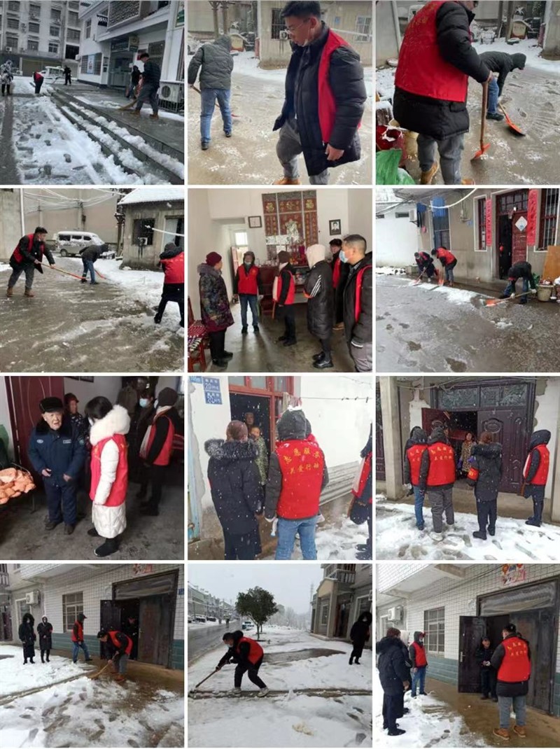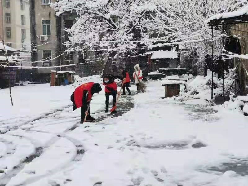 蔡家榨街组织全体干部、志愿者融雪、扫雪,上门为孤寡老人融雪,慰问,并宣传安全用气用电等知识。