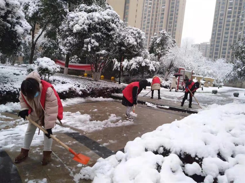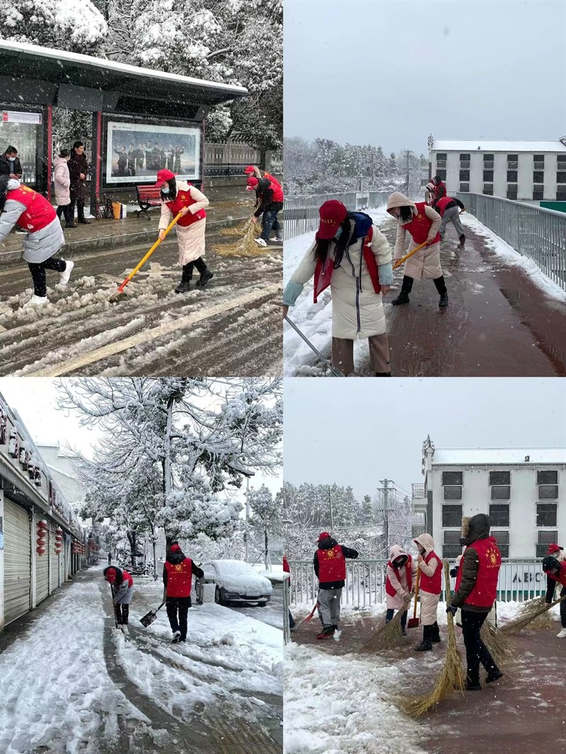 长轩岭街组织青年志愿者在街道机关、月湖路、公交站、人行天桥开展除雪消冰。