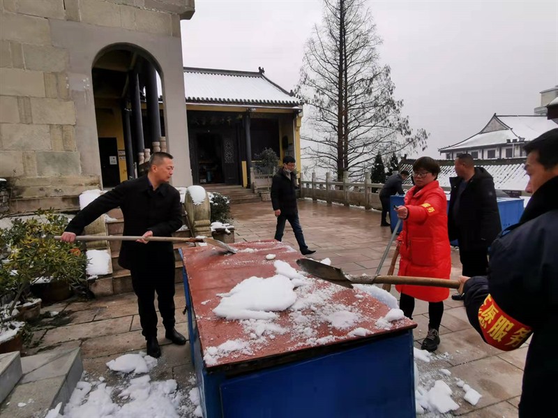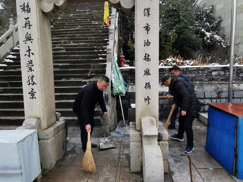 木兰山风景区服务中心带领干部职工志愿者铲冰除雪,保道路畅通,保游客安全。