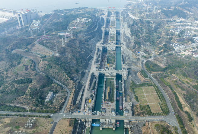 ? 2月21日拍摄的三峡五级船闸全景(无人机照片)。 从2月21日8时起,三峡南线船闸开始停航实施计划性检修施工,工期30天。南线船闸停航期间,北线船闸继续运行。 新华社发(郑家裕 摄)?