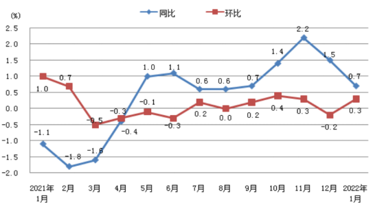 2021年1月—2022年1月CPI单月同比、环比涨跌幅