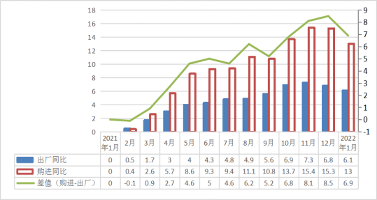 2021年1月—2022年1月PPI、IPI单月同比涨跌幅及差值(%)