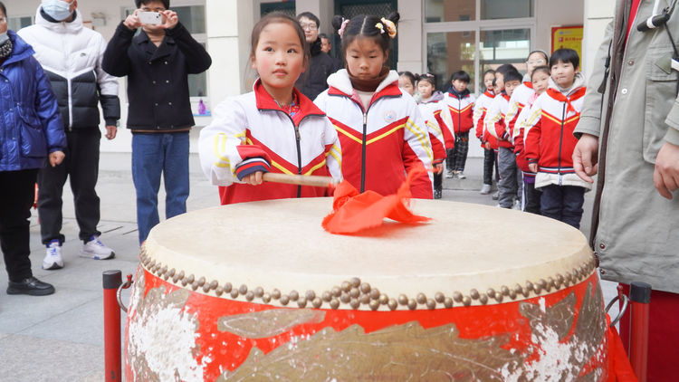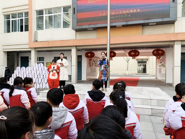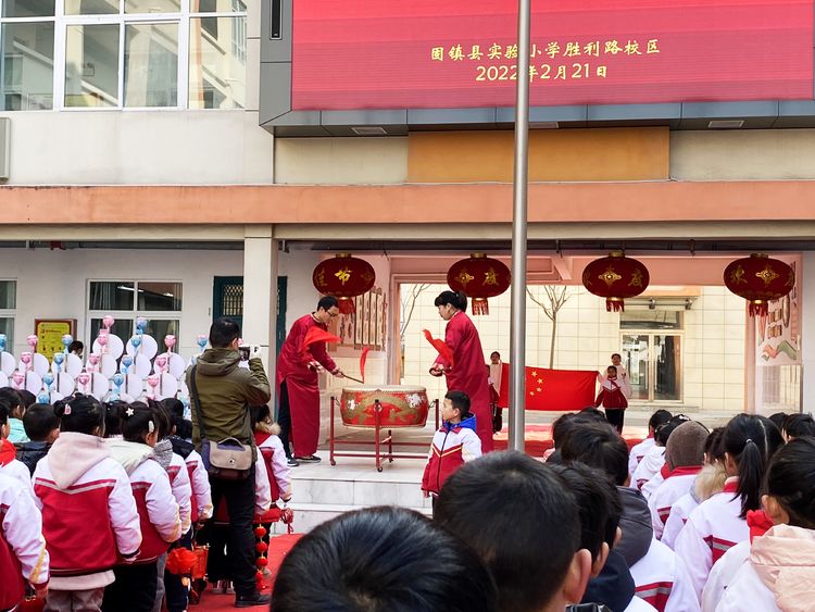 擂鼓声声显精神,旋律阵阵荡心田!在振奋人心的鼓点和激昂的音乐中,固镇县实验小学胜利路校区2021—2022学年度第二学期开学典礼暨表彰大会拉开了序幕!活动分为“老师擂鼓催奋进”“萌虎击掌送祝福”“学生献礼新征程”“国旗飘飘心飞扬”“工作回顾忆峥嵘”“刻苦努力结硕果”“优秀代表树榜样”“火炬接力扬国威”等环节。岁别丑牛千里锦,年逢寅虎校园欢!听,跫音阵阵传来;看,原来是人群中迎面跑来了一只“小老虎”!“它”正和我们打招呼呢!