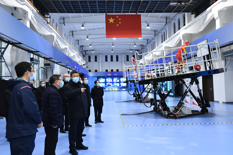 △1月4日,习近平总书记在北京考察2022年冬奥会、冬残奥会筹办备赛工作。这是习近平在二七厂冰雪项目训练基地六自由度训练馆考察。