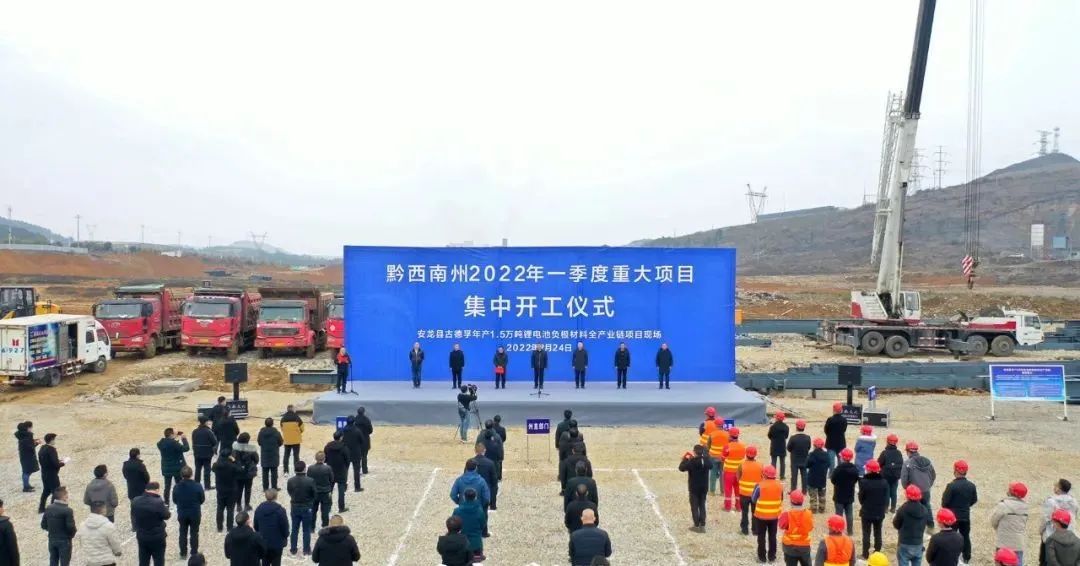 2月24日,黔西南州2022年一季度重大项目集中开工仪式在安龙县古德孚年产1.5万吨锂电池负极材料全产业链项目建设现场举行。