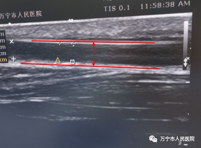 在完善对动静脉内瘘的相关检查中发现,动静脉内瘘静脉流出道距吻合口约5cm处内瘘杂音高调、震颤减弱,彩超检查发现此处存在5cm狭窄长度、内径宽度仅为0.18cm,在评估患者病情并取得患者同意后,决定为患者进行“超声引导下动静脉内瘘球囊扩张术”治疗狭窄问题,治疗后狭窄处内径改善,彩超下内径宽度变为0.289cm,透析时血流量可达280ml/min,能提供充足的血流量维持充分透析,达到治疗目的。