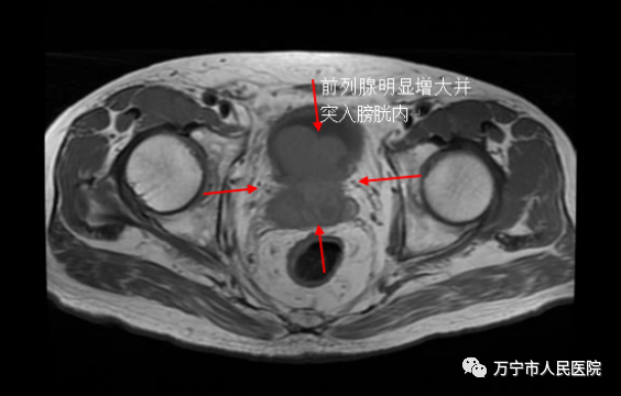 术前磁共振检查显示患者前列腺明显增大且突入膀胱内