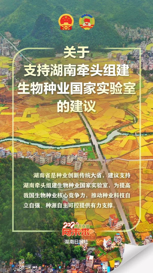 《关于支持湖南牵头组建生物种业国家实验室的建议》提出,希望中央明确以湖南岳麓山实验室为总部,以海南、甘肃、湖北、河南等为基地,以全国各研究机构为网络,构建覆盖全国的生物种业国家实验室体系,打造国家种业创新战略科技力量,为提高我国生物种业核心竞争力,推动种业科技自立自强、种源自主可控提供有力支撑。