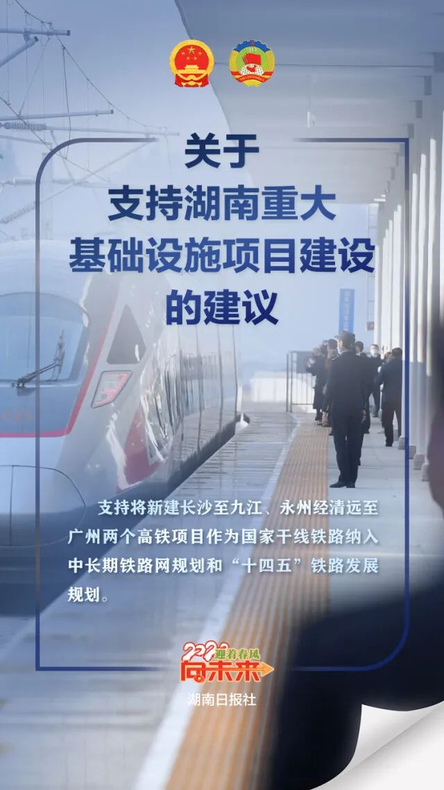 《关于支持湖南重大基础设施项目建设的建议》提出,长九高铁、永清广高铁项目通道两端均有建成或在建高铁,沿线途经国家中心城市、省会城市、重要区域枢纽节点城市,客流有保障,新增列入规划并尽早建设,有利于发挥现有路网投资效益,推动沿海地区与内陆地区协同发展。