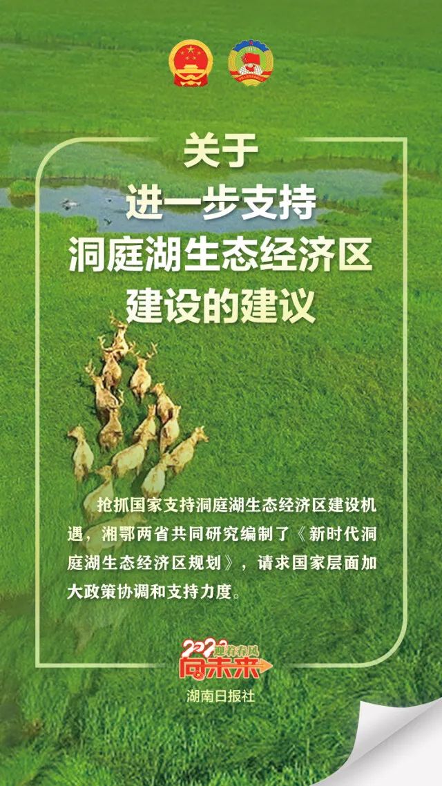 如何进一步提高湖区经济高质量发展?对此,湘鄂两省抢抓国家支持洞庭湖生态经济区建设机遇,共同研究编制了《新时代洞庭湖生态经济区规划》。《关于进一步支持洞庭湖生态经济区建设的建议》指出,规划对洞庭湖生态经济区生态环境保护与修复、绿色发展、城乡融合、基础设施、对外开放、民生福祉等七个方面进行了全面谋划。特别立足湖区区位和资源优势以及产业基础,提出以现代农业、先进制造业、现代物流业、文化旅游业等四大产业为重点发展布局,谋划了一批支撑生态经济区长远发展的重大工程,包括洞庭湖四口水系综合整治、重要堤防加固、蓄滞洪区建设等。希望国家有关部门指导和批复《新时代洞庭湖生态经济区规划》,并对规划内的重大项目给予重点支持。