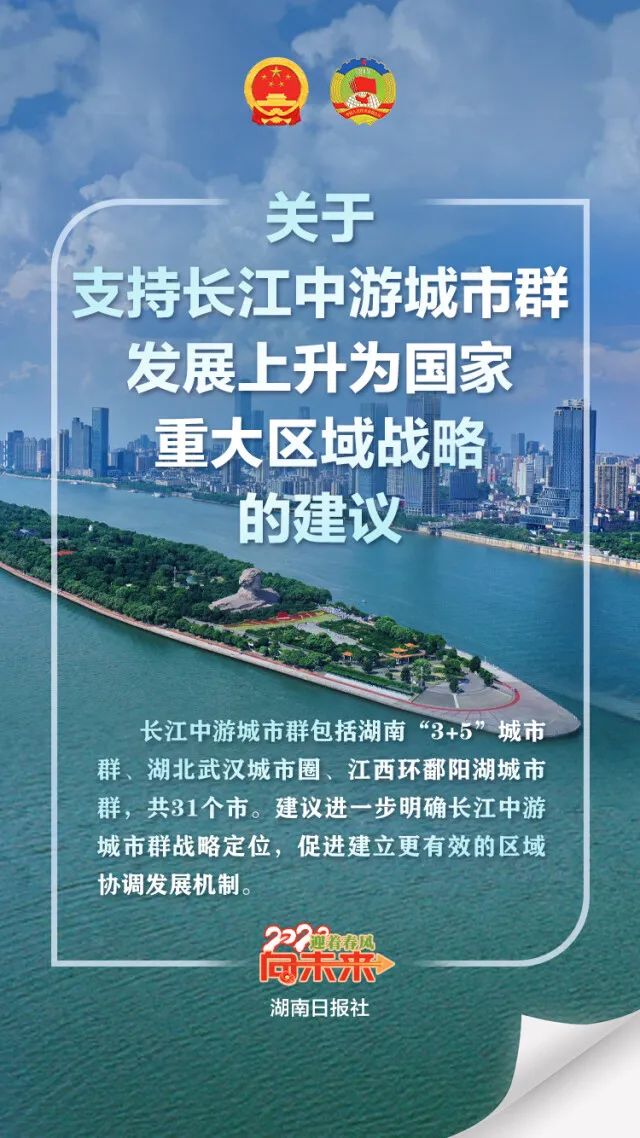 《关于支持长江中游城市群发展上升为国家重大区域战略的建议》提出,希望国家层面进一步明确长江中游城市群战略定位,建设“中三角”双循环发展示范区;尽快印发《长江中游城市群“十四五”实施方案》;推动建立高规格的中央层面联席会议机制;加大对长江中游城市群重大改革、重大项目、重大工程、重大平台的支持,包括支持建设统一的区域内市场准入标准,协调指导三省间轨道、公路、水运、民航跨省协同布局,推动三省基本公共服务互认共享等。