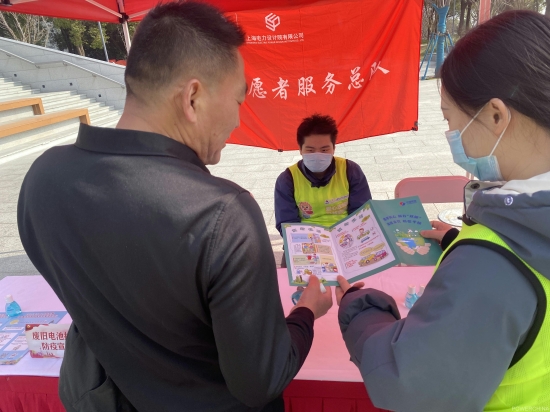 上海院青年志愿者来到了徐汇区滨江党群服务中心,发放自己制作的“双碳”宣传册,向市民普及“双碳”背景及意义,以及如何在生活中的“吃”、“穿”、“用”、“行”多方面做到低碳环保。并把各类低碳环保行为转化成相应减排的二氧化碳重量,用直观的数字让市民真切感受到——我们的一举一动与大自然息息相关。志愿者还为居民提供废旧电池回收与换新服务,唤起市民保护环境的意识。