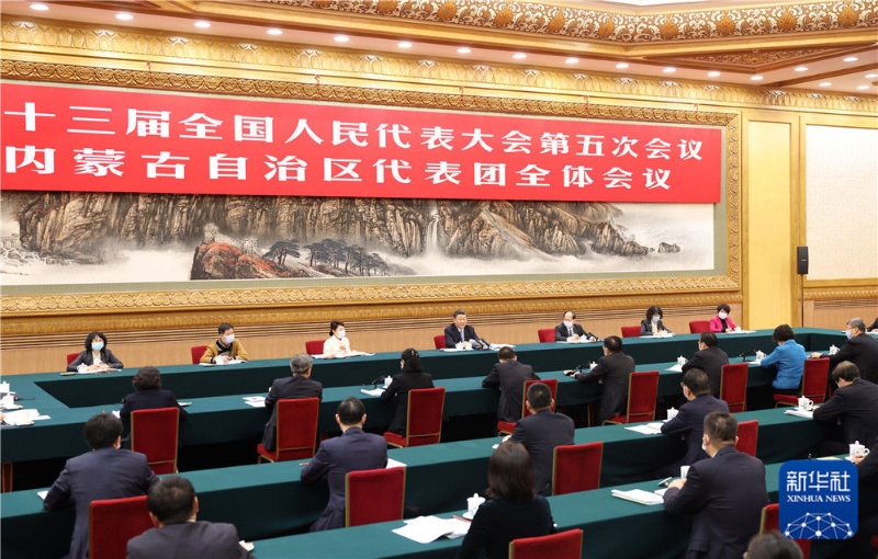 3月5日,中共中央总书记、国家主席、中央军委主席习近平参加十三届全国人大五次会议内蒙古代表团的审议。新华社记者 黄敬文 摄 在认真听取大家发言后,习近平作了发言。他首先表示赞成政府工作报告,肯定内蒙古一年来的工作,希望内蒙古的同志坚决贯彻党中央决策部署,统筹抓好疫情防控和经济社会发展各项工作,坚定不移走以生态优先、绿色发展为导向的高质量发展新路子,切实履行维护国家生态安全、能源安全、粮食安全、产业安全的重大政治责任,不断铸牢中华民族共同体意识,深入推进全面从严治党,把祖国北部边疆风景线打造得更加亮丽,书写新时代内蒙古高质量发展新篇章。