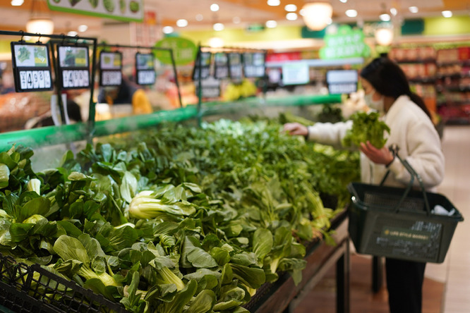3月21日,市民在江宁区一家超市买菜。 在抗击疫情的同时,江苏省南京市多措并举,做好民生保障工作,确保全市“菜篮子”“米袋子”供应充足、价格平稳。新华社记者 季春鹏 摄?