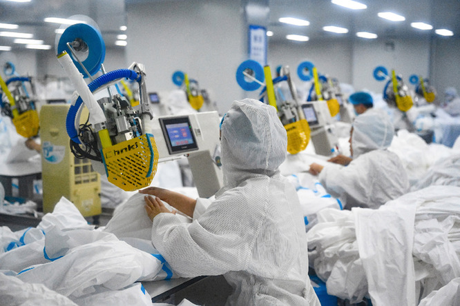 3月21日,工人在泉州晋江市一家防护服生产企业作业。 福建省泉州市本轮新冠肺炎疫情造成了较大的物资需求。连日来,作为民营经济重镇的泉州市,发动各方力量,在做好各项防疫措施的前提下,加紧生产各类生活必需物资,保民生、保供应。 新华社发(周义 摄)?
