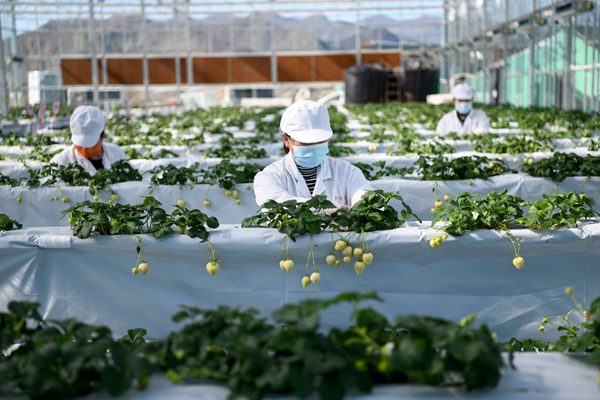 3月27日,在双滦区偏桥子镇偏桥子村草莓种植基地,工人在管护“白草莓”。