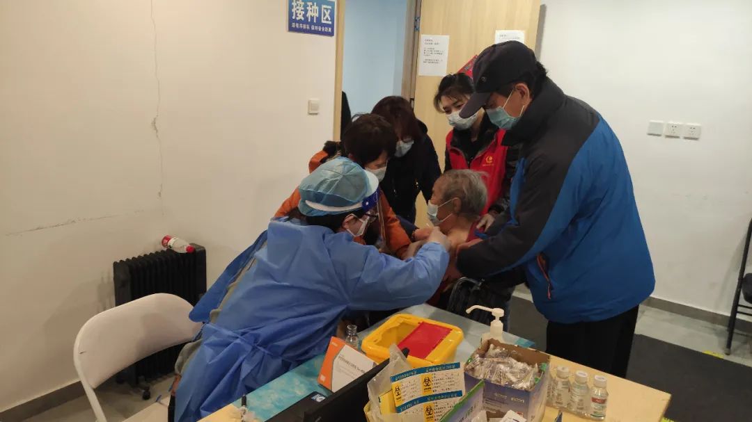 社区里的一些“90后”高龄老人也积极响应号召,纷纷加入了“疫苗接种大军”。家住和平西苑社区已有92岁高龄的安奶奶,是一名老社区志愿者,接种意愿较强,社区考虑到老人行动不便,特意安排3名社区工作者护送老人来到疫苗接种点。