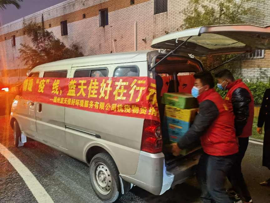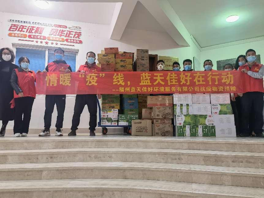 3月22日福州蓝天佳好环境服务有限公司为漳港社区采样点、漳港街道疫情防控指挥部送上价值数万元的慰问物资,负责人刘奎表示:“一线抗疫工作者为了我们广大群众的健康,冲锋在前、连续奋战、不畏辛苦,我们很感谢你们。我们企业除了做好本职工作外,也希望通过捐赠物资尽一份微薄之力,共树信心”