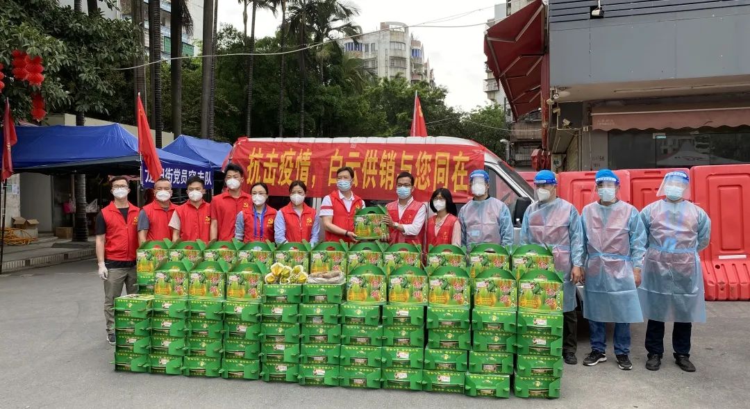 为让封控、管控区域内居民安心隔离,吃上新鲜的粮食及水果,广东省广州市白云区供销合作社立即联系领办的专业合作社采购1200斤新鲜的优质农产品,捐赠给114户隔离家庭。3月22日一早,白云供销服务队队员来到合作社,合力将蔬果进行分拣、打包、装车,由专人专车送到指定地点,并由各楼栋党群先锋队队员分发给每户隔离家庭。