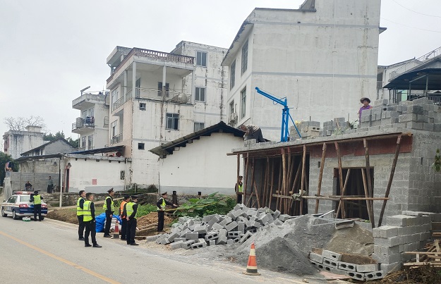 图为工作人员处置违法建房行为现场。