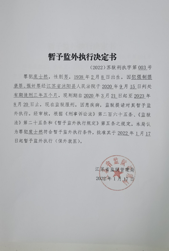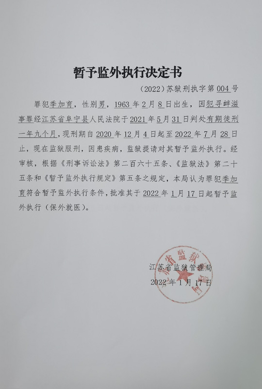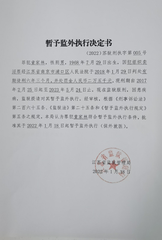 暂予监外执行决定书(2022)苏狱刑执字第003-005号