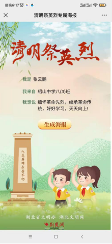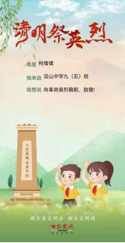 线上祭奠,缅怀革命先烈。“虽不能至,然心向往之。”网上祭扫是寄托哀思的良好载体。根据通知精神,沼山中学迅速部署线上祭英烈工作,各班将湖北文明网“清明祭英烈”页面链接转发至班级群,指导学生登录平台,在其开设的专题页面,进行网上祭拜、献花、留言,以表达对先辈的追远、缅怀。学生们积极参与,纷纷截图回传班级群,这一刻,爱国主义的热情被充分激发和调动。
