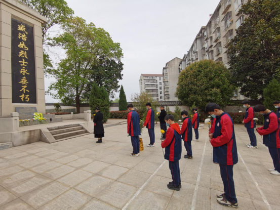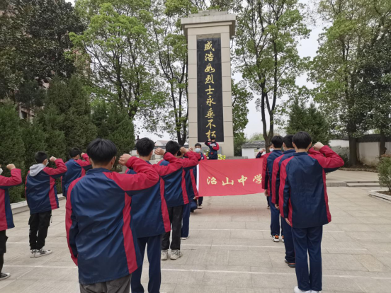 陵园扫墓,追思英烈先贤。与此同时,在政教处、团支部的组织带领下,来自学校各班的20名优秀学生代表前往梁子镇盛浩如烈士陵园祭扫。苍松翠柏掩映下,革命烈士纪念碑巍峨耸立、庄严肃穆。一到达陵园,同学们便拿起携带的劳动工具打扫卫生,经过集中清理,墓地干干净净,环境焕然一新。随后,团支部书记王冠群介绍烈士的光荣事迹,历史的风云激荡着同学们的内心,让大家仿佛看到了盛浩如烈士在战场上誓死拼杀的场景。接着,全体学生向烈士默哀、鞠躬、敬献鲜花,表达对烈士的最崇高的敬意。“我是革命事业接班人。我在烈士墓碑前宣誓:继承先烈遗志,热爱祖国,忠于党、忠于人民……”深受感染的同学们高举右拳进行集体宣誓,洪亮的声音久久回荡。最后,政教副校长张文兵总结发言,他鼓励同学们要继承先烈的遗志、珍惜来之不易的幸福生活、认真学习、积极向上,为实现美好的人生理想而奋斗!