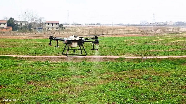 展开机臂,调整桨叶。启动遥控,旋翼嗡鸣,无人机腾空而起,按照规划好的路线飞行。药水向下喷洒,近百亩油菜地,只用1小时就完成作业。