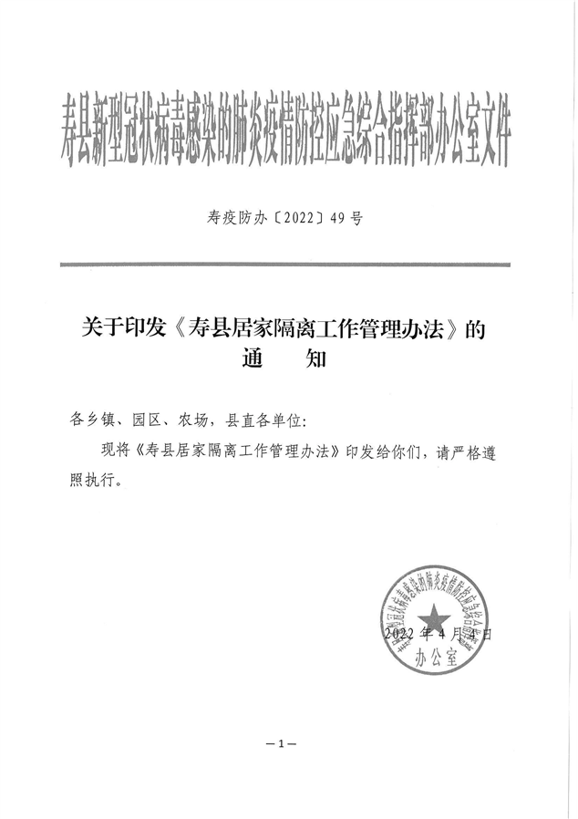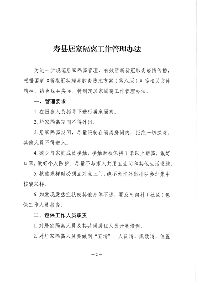 关于印发《寿县居家隔离工作管理办法》的通知