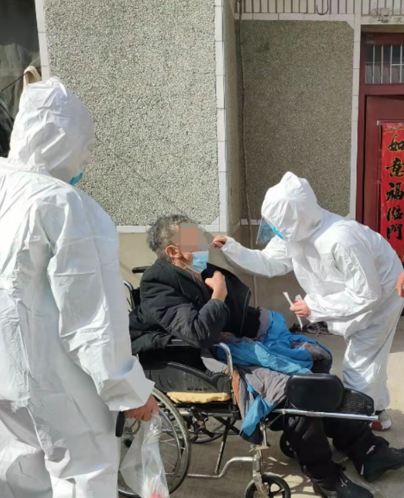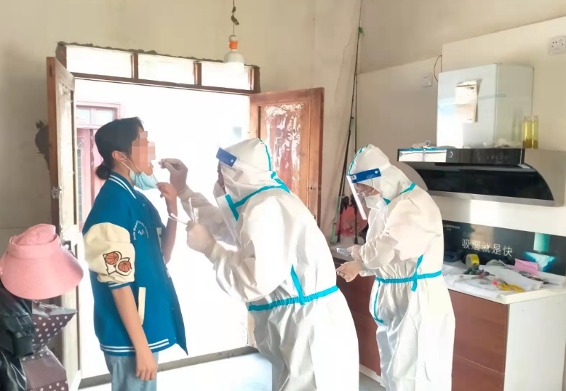 采样台前,妈妈负责居民身份信息核对、登记与录入,女儿的任务是对受检者进行咽拭子采集。因为是全员筛查,任务量较大,一个村的样本采集完成前,饭不能吃,水不能喝,厕所也不能上,一站就站四五个小时。农村以留守老人和儿童居多,没有预检码、忘带身份证,孩子哭闹不配合......种种突发状况使采样时间总在延长。20多度的室外环境,密不透风的防护服,不出一个小时,衣服便已汗透了。采样点采样结束,母女俩又进村入户,为重度残疾人等特殊群体上门采样,谁也不说苦不叫累,认真仔细做好每一名群众的登记及采样工作。