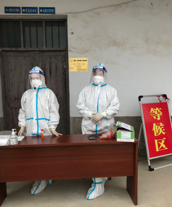 在张李乡全民核酸检测马郢村采样点上,母女俩一起摆放采样台,准备消毒液、口罩、采样试管等物资,准备工作就绪,二人穿上厚厚的防护服和鞋套,带上面罩,相视一笑,走上自己的工作岗位。