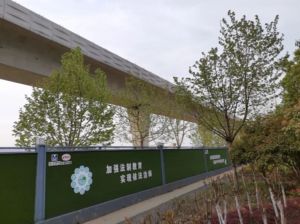 新建成的高架,一排桥墩列队矗立,仰望犹如一条巨龙,气势磅礴。特别是高架旁行道树吐露出的新绿,与高架早已融为了一体,形成一道亮丽的风景线,一眼望去十分养眼。行走在3个高架区间,地面高达4米的绿色围挡把施工现场封闭得严严实实,施工现场与外界隔离,围挡外公益广告处处可见,紧固且整洁。同时,围挡还专门留出了道路口,车流、人流从高架下方顺畅通过,显得十分井然有序。
