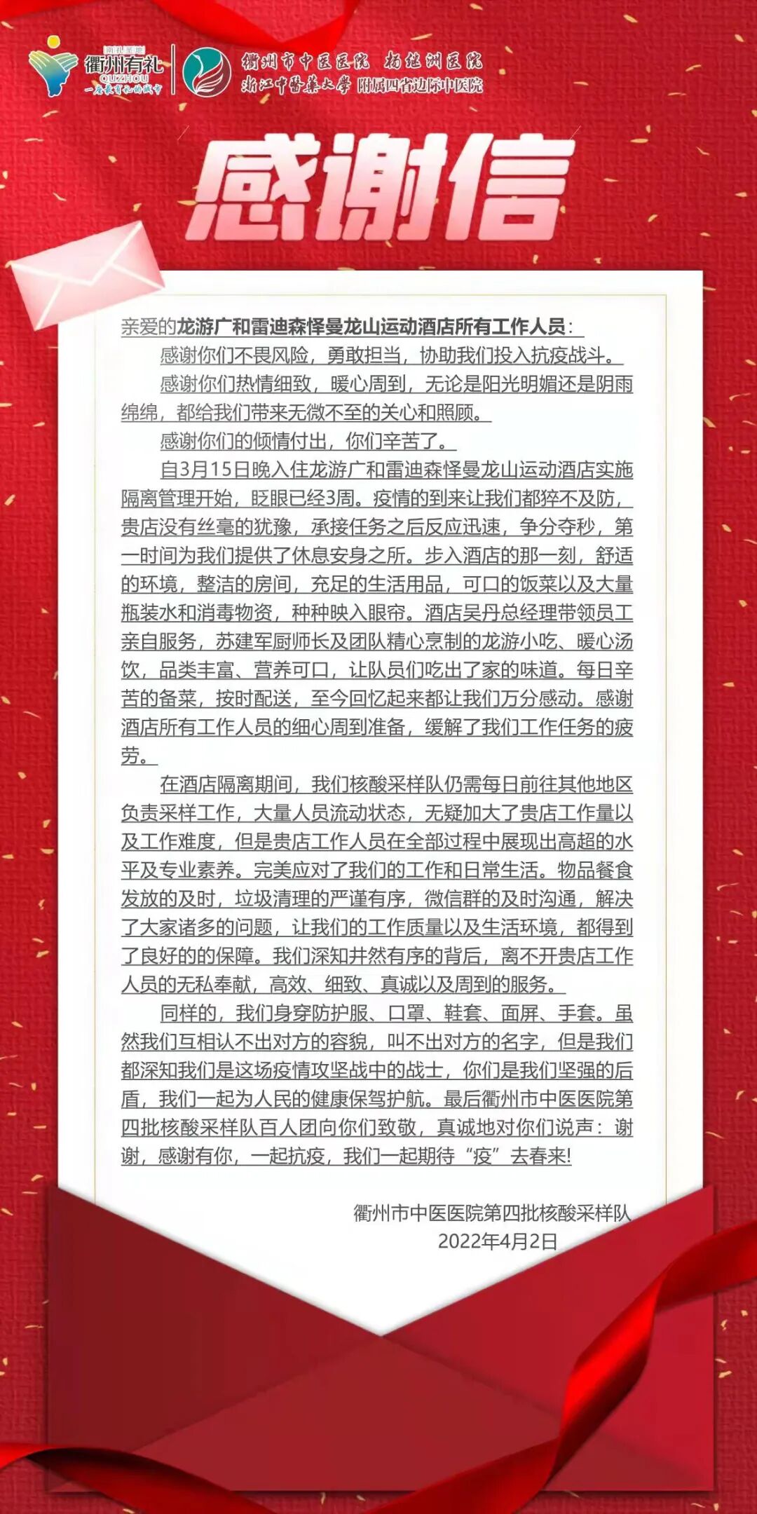 “谢谢你们不畏风险,勇敢担当,协助我们投入抗疫战斗。”日前,龙游广和雷迪森怿曼龙山运动酒店收到一封来自衢州市中医医院第四批核酸采样队的感谢信,致谢酒店工作人员在抗疫背后的悉心服务。信中朴实的语言处处流露着浓浓的真情与深深的感激,让酒店工作人员热泪盈眶,也见证了这座城市的温情守护。